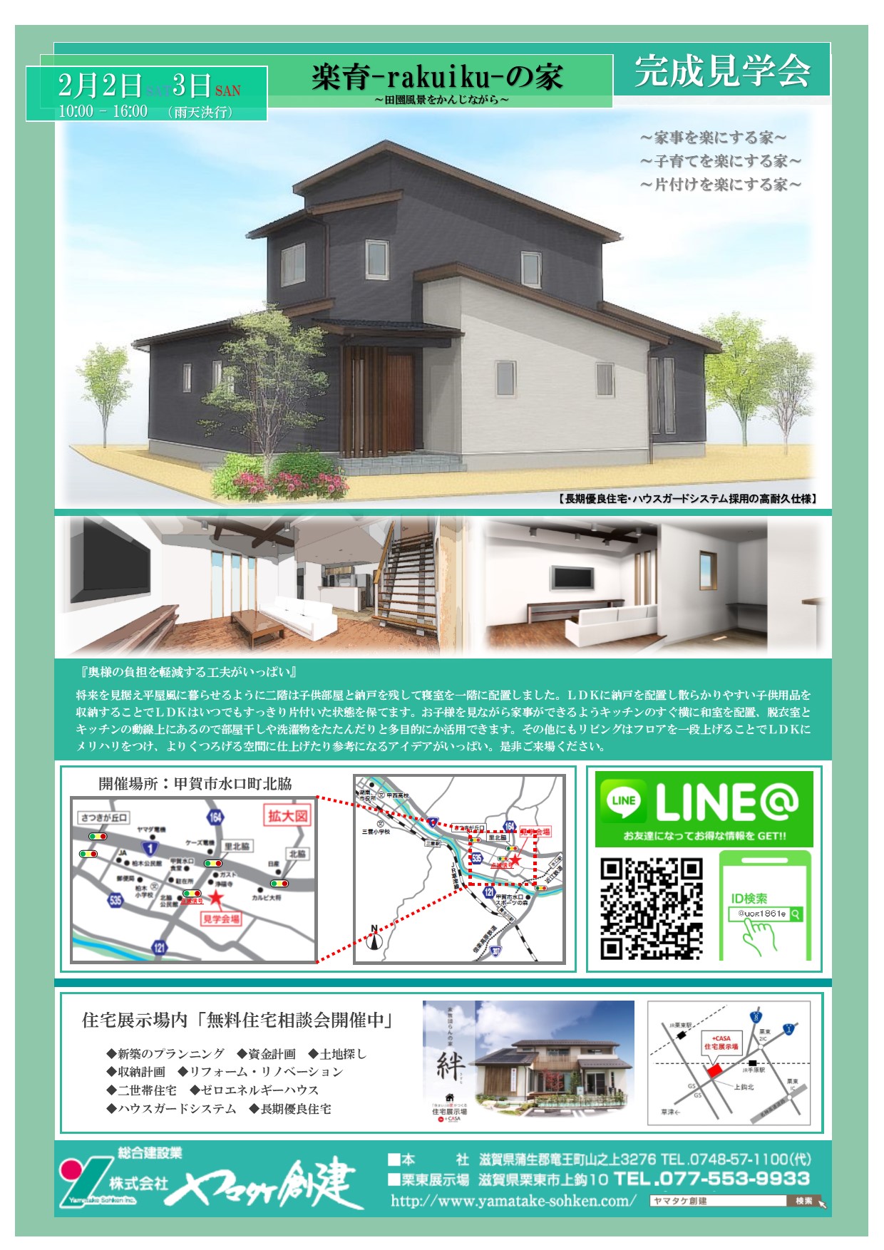 甲賀市水口町北脇にて2月2~3日オープンハウスを開催します。 現地詳細来場予約は077-553-9933に連絡ください。