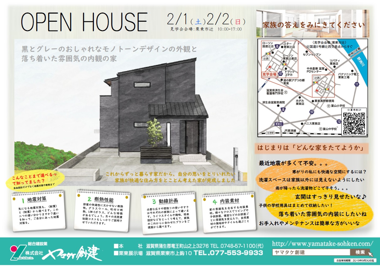 2020年02月01日 お知らせ 完成見学会 栗東市辻 2月1日、2日と栗東市辻で完成見学会を開催いたします。 くわしくはチラシをご覧ください。 さらに、2月8日、9日は野洲市行畑で完成見学会を開... /続きを読む