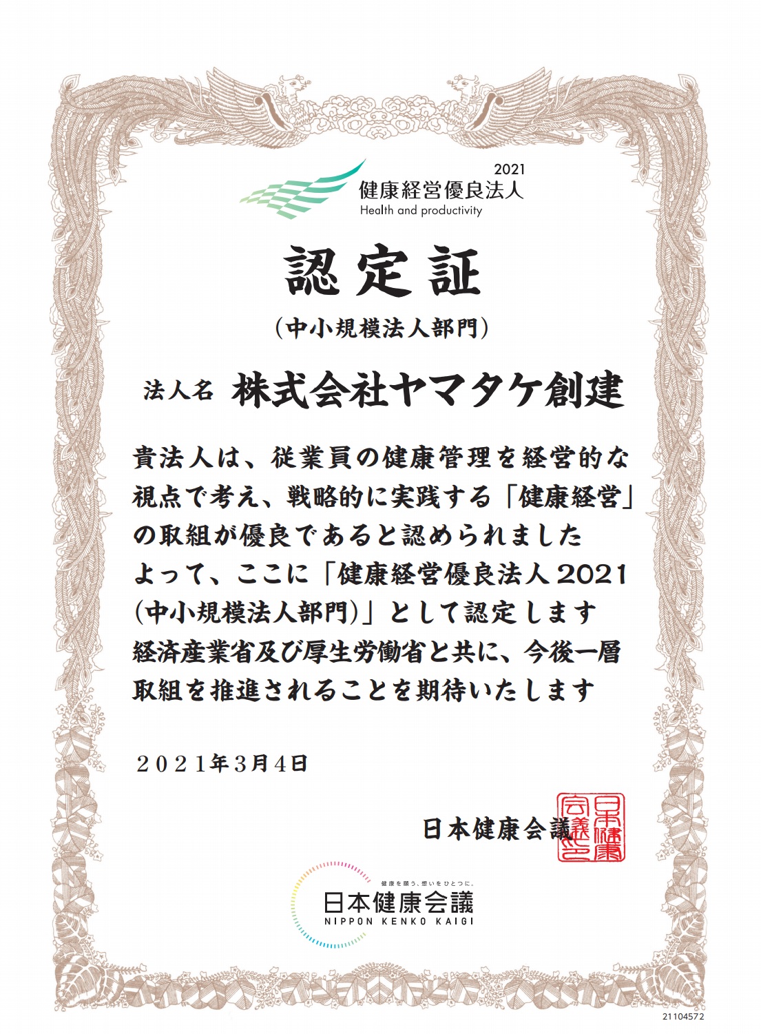 2021年03月12日 お知らせ 健康経営優良法人 2021認定書取得しました 令和3年3月に、経済産業省が選出する「健康経営優良法人2021」に弊社が認定されました。 健康経営優良法人認定制度とは、地域の... /続きを読む