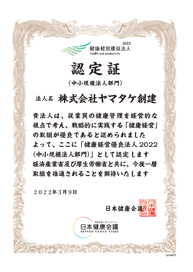 2022年03月11日 お知らせ 健康経営優良法人 2022認定書取得しました 令和4年3月に、経済産業省が選出する「健康経営優良法人2022」に弊社が認定されました。 健康経営優良法人認定制度とは、地域の健康課題に即した取組... /続きを読む